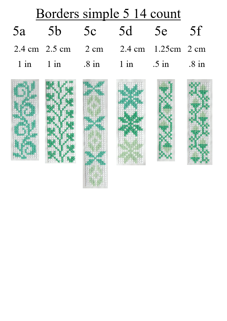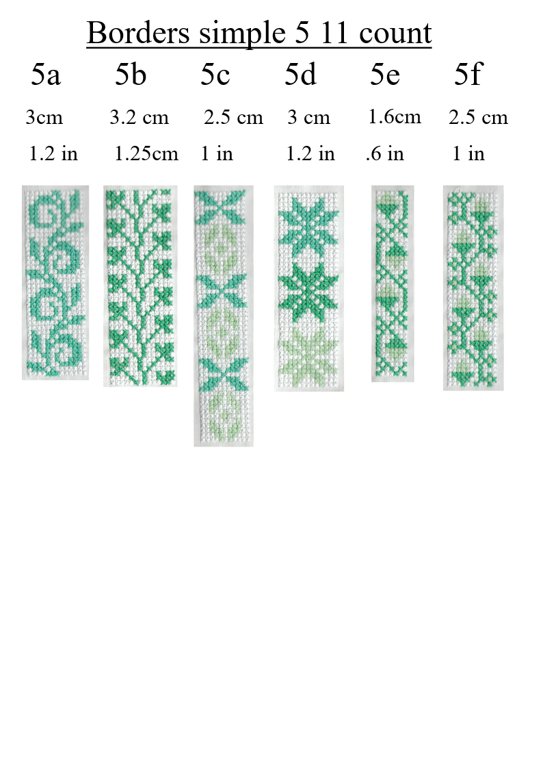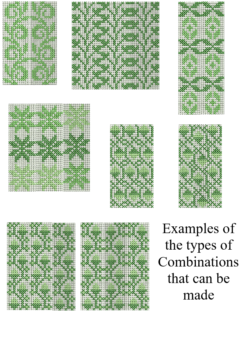 Each design is a fully filled block of crossstitches, which makes for easy matching, however, depending on the design, it is easy to omit the background and just sew the main design as a surface embellishment. They are perfect for filling in gaps, creating edges or frames. Combine them for interesting cuffs, collars, hems. Used side by side they can create interesting block fills.